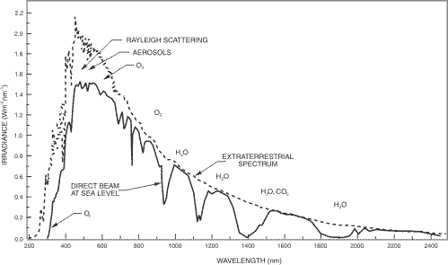 標(biāo)準(zhǔn)太陽光譜和穿透大氣層到達(dá)地球表面的太陽光譜如下: