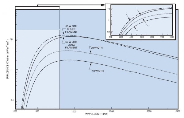 The Light Source uses different power lamps as its illumination source. This Tungsten Halogenlamp exhibit better output stability than arc lamps and do not produce strong UV light emission or toxic ozone. Their smooth spectral output curve make them useful for radiometric and photometric applications.