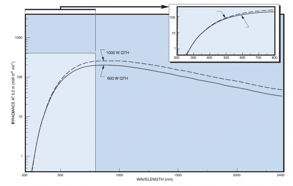 The Light Source uses different power lamps as its illumination source. This Tungsten Halogen lamp exhibit better output stability than arc lamps and do not produce strong UV light emission or toxic ozone. Their smooth spectral output curve make them useful for radiometric and photometric applications.