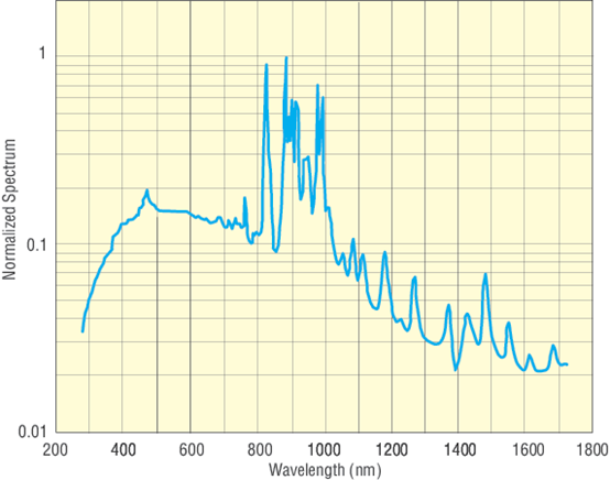 100W氙燈光源采用無(wú)臭氧氙燈(6002)作為照明光源,氙燈光譜覆蓋紫外、可見(jiàn)和近紅外,和太陽(yáng)光譜其近似,廣泛作為太陽(yáng)能模擬器。因高功率、寬譜輸出而受吸收和熒光激發(fā)等歡迎。光譜范圍260nm以上,無(wú)臭氧。